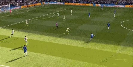 丢球了,切尔西在主场总该有些变化了吧,你不能说没有,这体现在他们的前场逼抢力度稍有提高,但并没有提高到足以干扰曼城后场球员起脚质量的高度,所以曼城反而打出了两次不错的打身后,这就把切尔西又给打回去了: