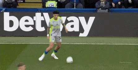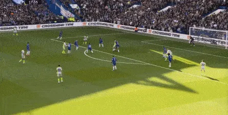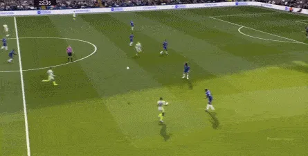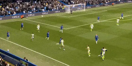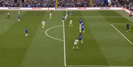 这种情况下,帕尔默和若昂-佩德罗又不能直接从中路打出进攻,也就不能吸引防守重心,从而给边路制造出更大的空间,所以在上半场后半段,切尔西的威胁进攻就变得很少了,这次帕尔默在中路实际失误,但错进错出形成的传中,就是为数不多的机会了: