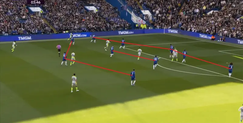 在这之前,他一直在尝试四中场的思路,甭管是恩佐打边,还是帕尔默打边,思路都是以此来建构潜在的三、四后卫切换和中场优势,从而打出两条边路的进攻。